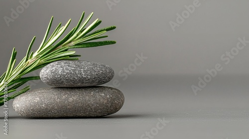Obraz premium Stacked grey stones with fresh rosemary sprig on grey background.