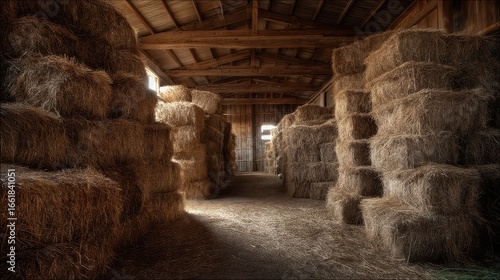 Fototapeta premium Stacked Hay Bales in Rustic Barn Interior with Natural Lighting
