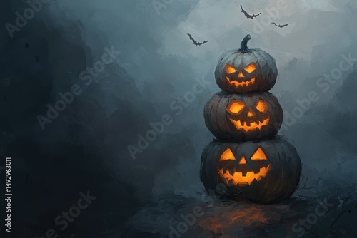 Naklejka premium Stacked jack o lanterns with bats on a foggy night for halloween decorations, greeting cards, and festive backgrounds.