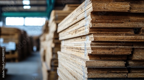 Obraz premium Stacked plywood sheets in a warehouse. This image is perfect for illustrating...