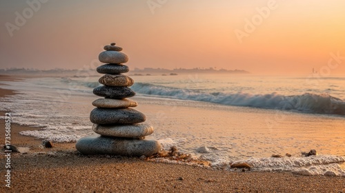 © Rafanudin, Fototapeta premium Stacked Stones On Beach At Sunrise