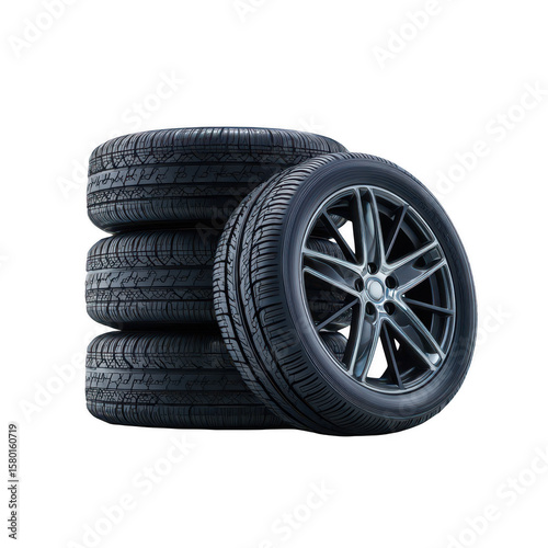 © Nisaa, Naklejka premium Stacked tires and wheels. Dark, realistic image