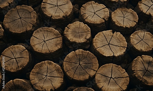 © Azril, Naklejka premium Stacked tree stumps, textured wood background, nature, rustic, design