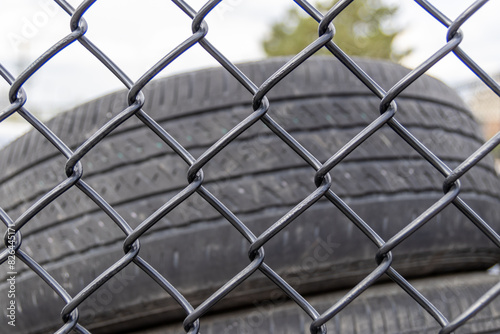 © Jacob Tian, Fototapeta premium Stacked used tires - behind chain-link fence - under cloudy sky. Taken in Toronto, Canada.