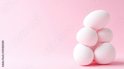 © PAPAHJAHATZ, Fototapeta premium Stacked white eggs on pink background