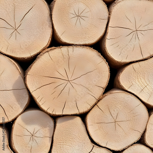 © queen, Naklejka premium Stacked wood logs, outdoor sunlight. Texture background