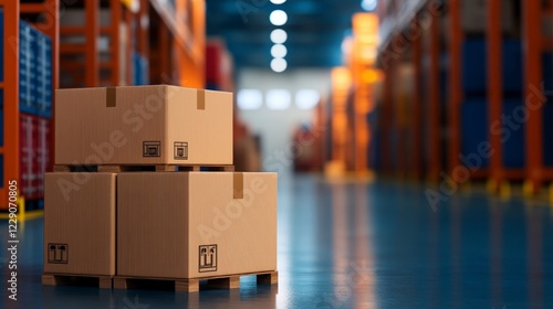 © Maggi, Obraz premium Stacked Wooden Boxes on Pallet in Spacious Warehouse with Bright Aisle Lighting