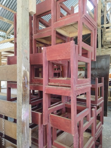 © Ahmad Jamiardi , Obraz premium Stacked wooden chairs. No people.
