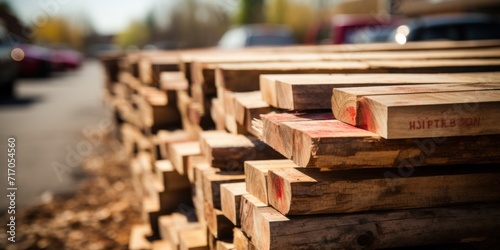 © kaleidoscope, Obraz premium Stacked wooden pallets in focus with blurred urban backdrop in daylight