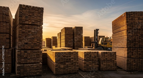 © RIDEC, Fototapeta premium Stacked Wooden Planks in Large Outdoor Lumberyard with Forklift at Sunset