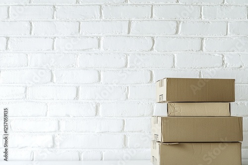 Obraz premium Stacking Cardboard Boxes Against White Brick Wall: A Simple Storage Solution