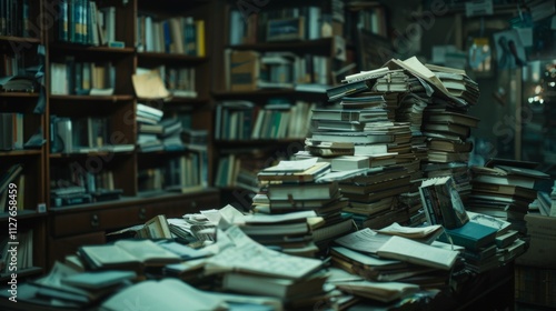 Fototapeta premium Stacks of documents on a cluttered desk symbolize overwhelming bookkeeping...