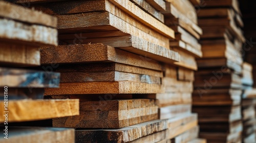 © Suphawan, Fototapeta premium Stacks of neatly arranged wooden planks at a lumber yard ready for construction projects