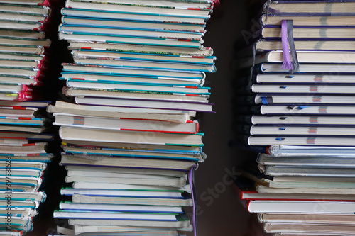 Obraz premium Stacks of old discarded school textbooks waiting to be disposed of in a...