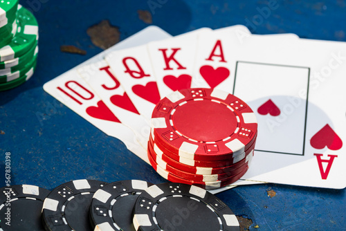 Obraz premium Stacks of poker chips with money and cards