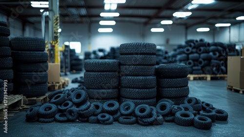 © Bejo Studio, Obraz premium Stacks of tires fill a large warehouse with bright overhead lighting