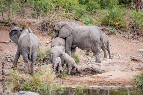 Fototapeta premium Stada słoni w Parku Narodowym Krugera piją przy wodopoju, cała rodzina z...