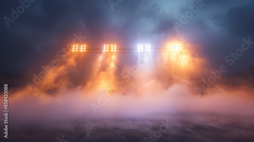 Fototapeta premium Stadium floodlights illuminating through dense fog during night, creating a...