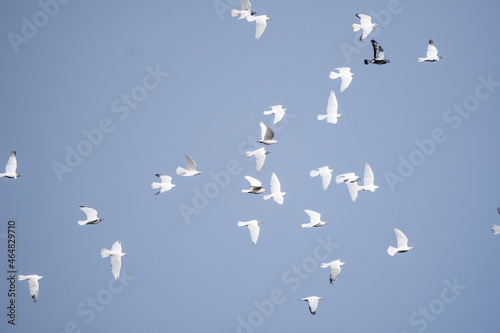 © Arkadiusz, Obraz premium Stado białych gołębi latające po niebieskim niebie. gołębie, ptaki.