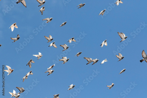 © stockphoto mania, Fototapeta premium stado gołębi wyścigowych prędkości latające na tle jasnego nieba
