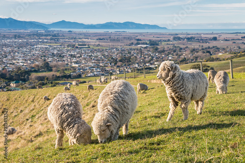 Naklejka premium stado owiec merynos wypasanych na gruntach uprawnych nad miastem Blenheim w...