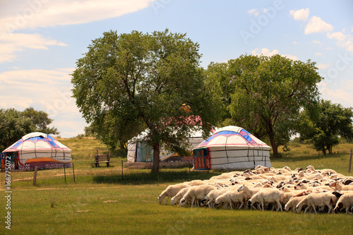 Naklejka premium Stado owiec na pastwiskach Mongolii Wewnętrznej oraz jurty, w których ludność...