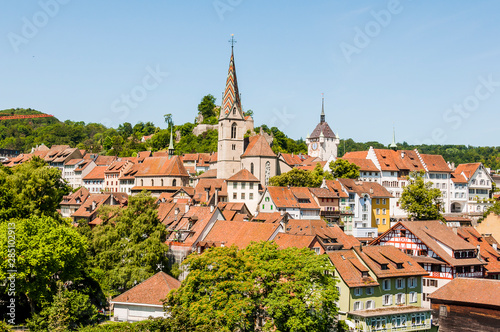© bill_17, Fototapeta premium Stadt Baden, katholische Kirche, Stadtturm, Altstadt, Schlossberg, Ruine, Altstadthäuser, Aargau, Sommer, Schweiz