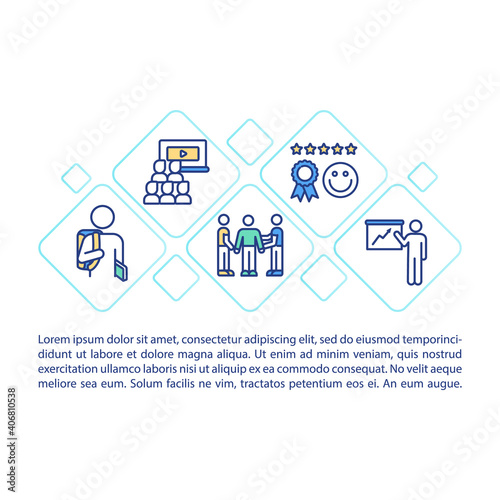 Fototapeta premium Staff training concept icon with text. Teaching your employees new things for improving company. PPT page vector template. Brochure, magazine, booklet design element with linear illustrations