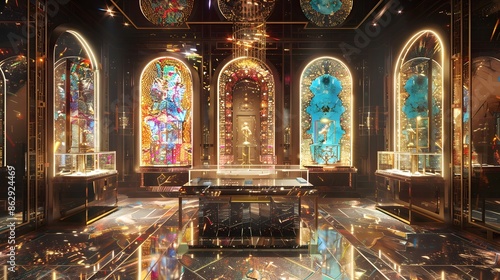 © sungedi, Obraz premium Stage podium with lighting, Stage Podium Scene with for Award Ceremony on blue Background.