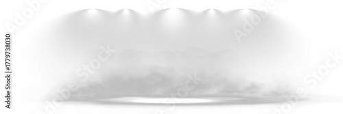 © NAUM, Naklejka premium Stage spotlight effect with multiple white beams illuminating smoke and fog on transparent background.