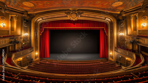 © Taiwo, Obraz premium Stage with red curtains. Cinema theater stage with curtains. Stage with curtains and spotlight. Interior of a theater. Empty cinema hall.