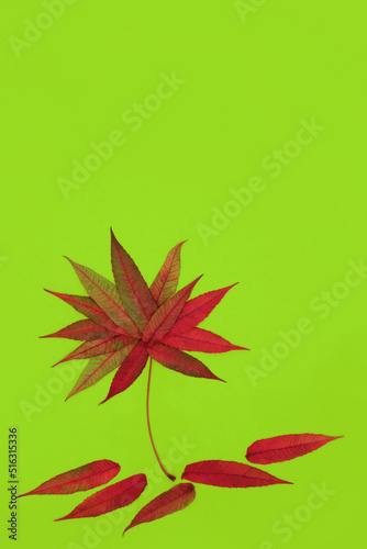 © marilyn barbone, Fototapeta premium Staghorn sumac leaf abstract tree shape Autumn design concept with vivid russet Fall colours on green background. Minimal surreal nature leaves composition. Rhus typhina.