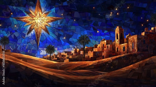 Obraz premium Stained glass artistic impression of the city of Bethlehem with the northern star in a blue night sky