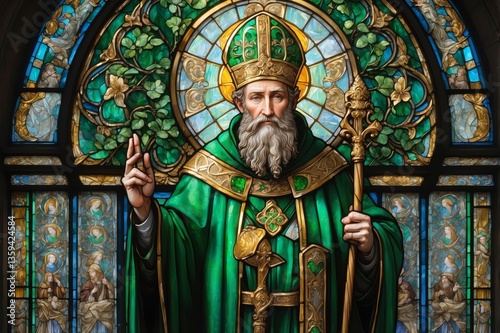 Fototapeta premium Stained glass depiction of St. Patrick, holding a bishop's staff, with shamrocks.