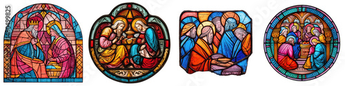 © Gasipat, Fototapeta premium Stained glass fragment with colorful biblical scene, Concept of sacred art, storytelling, and tradition, isolated on Transparent background