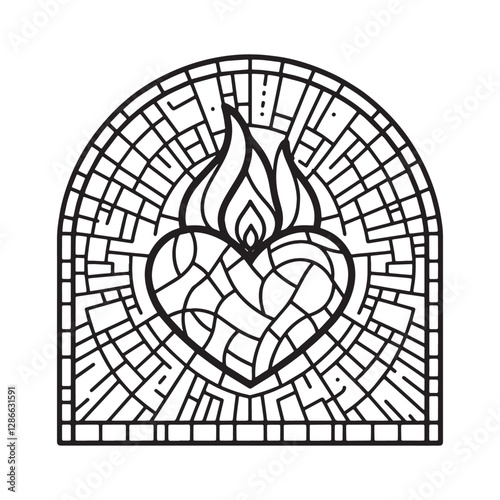 Obraz premium Stained Glass Heart with Mosaic Flame in Arc Window Design Illustration