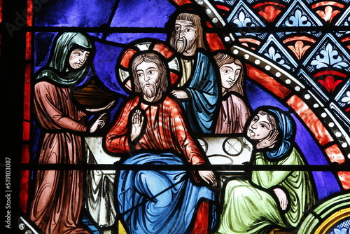 © Julian, Obraz premium Stained glass in Notre Dame de Coutances cathedral : Jesus with Martha and Mary