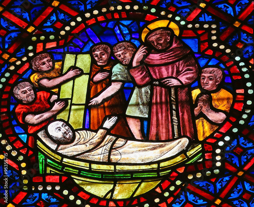 © jorisvo, Fototapeta premium Stained Glass of a dying man and a Catholic Saint in Cathedral o