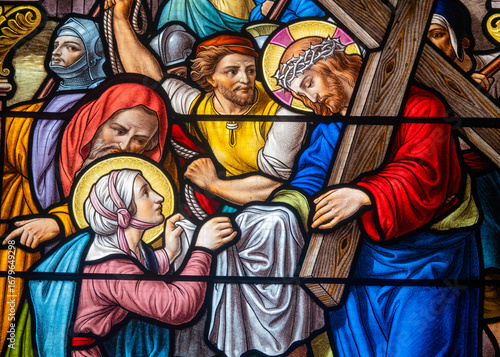 © Joan, Fototapeta premium Stained glass (1914) of The Way of the Cross. Sixth station: Veronica wipes Jesus' face.