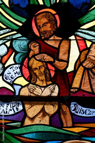 Obraz premium Stained glass representing the baptism of Christ. Vitrail représentant le bâptème du Christ. Annecy - France