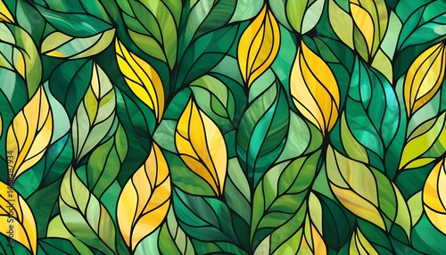 Fototapeta premium Stained Glass Style Green and Yellow Leaves Seamless Pattern
