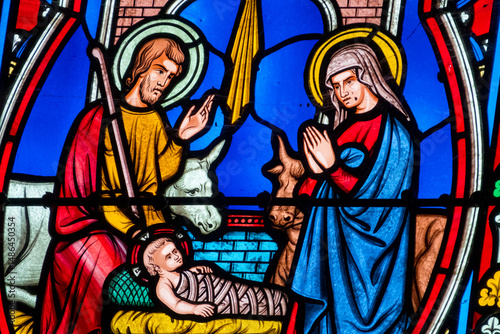 © Joan, Obraz premium Stained glass (19th century) of Christmas Nativity Scene with Virgin Mary, Saint Joseph, and Jesus baby.