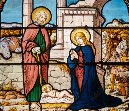 © Joan, Fototapeta premium Stained glass (19th century) of Christmas Nativity Scene with Virgin Mary, Saint Joseph, and Jesus baby.