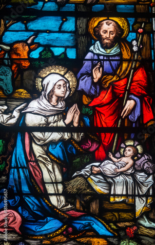 © Joan, Fototapeta premium Stained glass (19th century) of Christmas Nativity Scene with Virgin Mary, Saint Joseph, and Jesus baby.