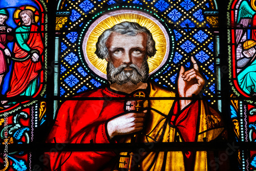 © Joan, Fototapeta premium Stained glass (19th century) of Saint Peter the apostle with the keys of the Church.