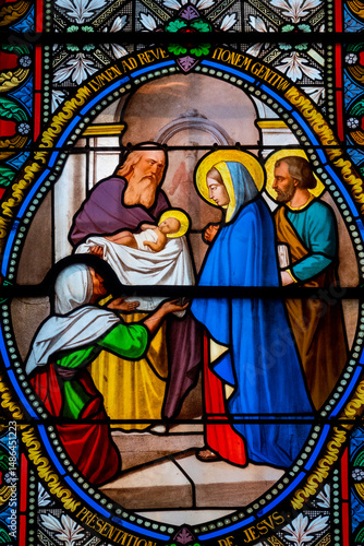 © Joan, Fototapeta premium Stained glass (19th century) of The childhood of Jesus: Presentation of Jesus at the Temple.