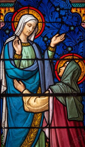 © Joan, Obraz premium Stained glass (19th century) of Visitation of the Virgin Mary to her pregnant cousin Elizabeth.