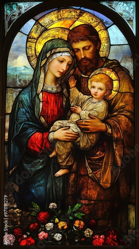 Fototapeta premium Stained glass window depicting the holy family posing together