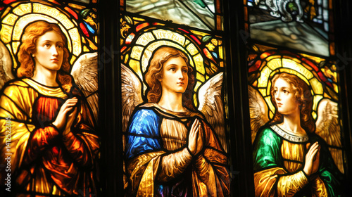 Fototapeta premium Stained glass window depicting three angels in prayer with vibrant colors and...