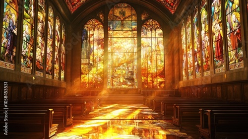 © KYR, Fototapeta premium Stained glass windows depicting Biblical scenes, with sunlight streaming through an empty sanctuary.